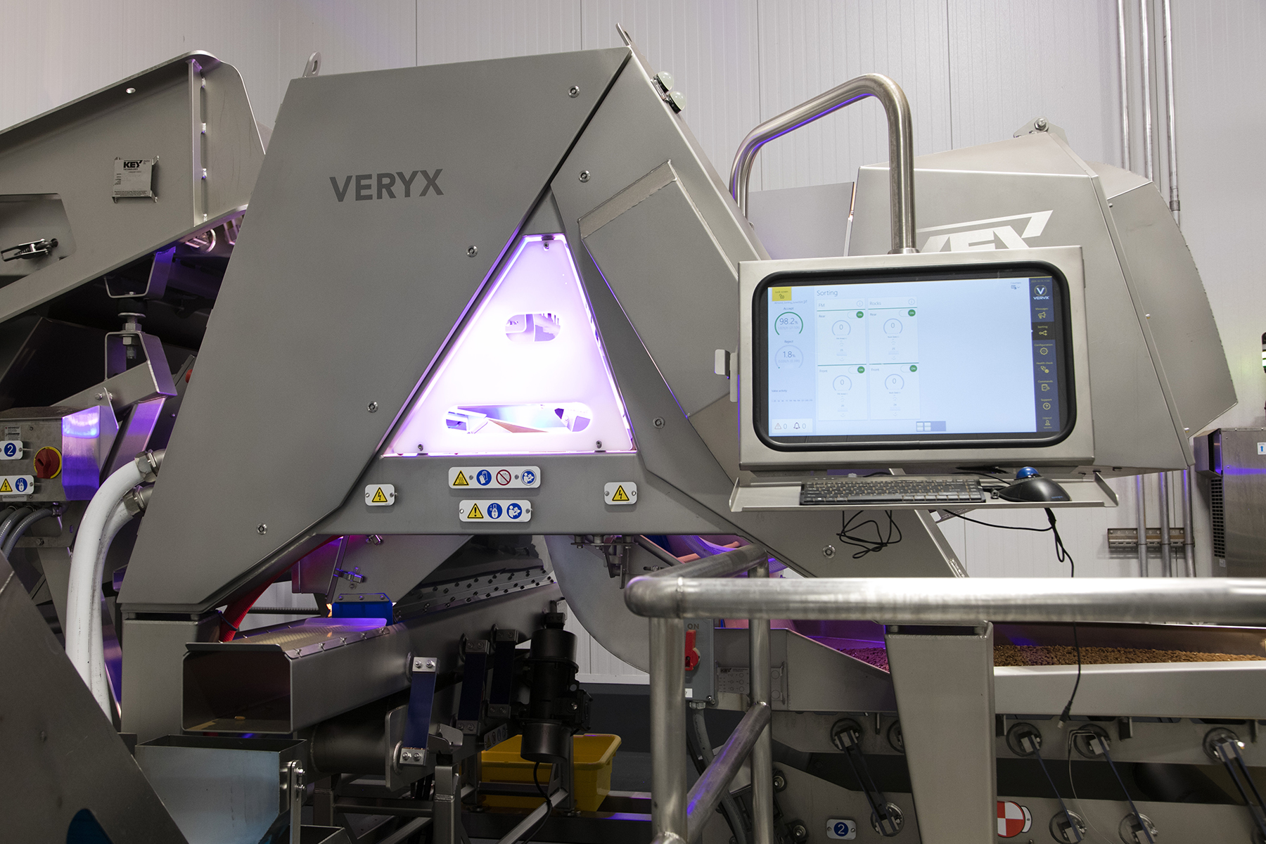 Next, an infeed conveyor creates the optimal product spread for inspection by either a VERYX® or COMPASS® optical sorter, depending on processor requirements. Key tailors each sorting system with the best combination of sensors and ejectors to detect and remove foreign material, shell fragments and product defects specific to each nut variety.